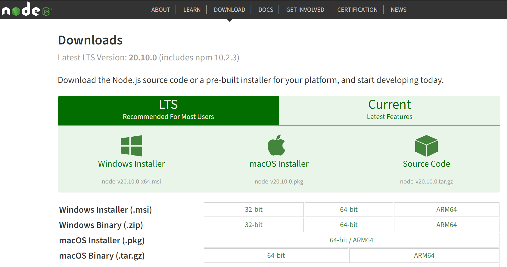 1. Щоб інсталювати Node.js і npm у Windows, спочатку відвідайте офіційну веб-сторінку Node.js і завантажте останню версію інсталятора Node.js для Windows.